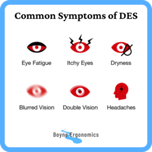 The symptoms of DES can affect the eyes, visual acuity and the musculoskeletal system. The symptoms experienced by DSE users and their severity will be influenced by personal, environmental, task and screen related factors.