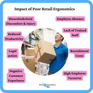 For employers in the retail industry, the cost of ignoring ergonomic concerns can be significant. Employee absenteeism due to injuries, decreased productivity, lack of trained or qualified staff, cost of training new staff, and high turnover rates can all contribute to substantial financial losses.