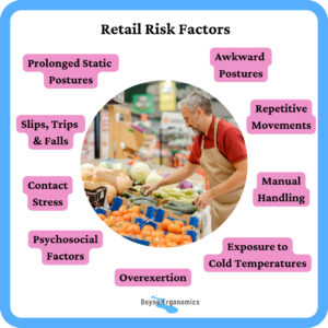 The ergonomic factors that pose a risk to the health and wellbeing of retail workers can be both biomechanical and environmental.