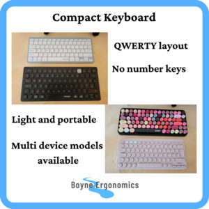 These keyboards have a similar layout to the standard size QWERTY keyboard without the hot keys and number pad on the right-hand side, making them smaller and more portable. These keyboards are great for small workstations, remote workers and users with right upper limb discomfort. They allow for improved mouse positioning on the right. If the user requires the number pad, separate number pads can be purchased and placed on the left-hand side when in use so it does not affect mouse position and take some of the workload off the right upper limb.