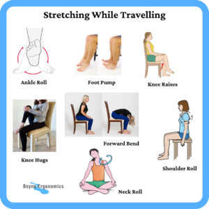 Whether you’re sitting in a car, train, or airplane, maintaining good posture is crucial. Sit with your back straight and supported with shoulders relaxed.