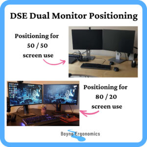 If you use one monitor as a main monitor and one as a secondary holding monitor, for emails or reference documents (80/20 use) position one monitor directly in front of your seated position. The second monitor should be positioned next to this main monitor and turned in towards the seated position to reduce repetitive neck postures.
