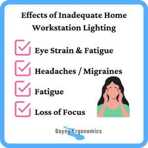 It is important to step back and review the lighting levels at the home DSE workstation to reduce the risk of digital eye strain. For more information on digital eye strain, check out the blog post titled “Are You Suffering From Digital Eye Strain?”.