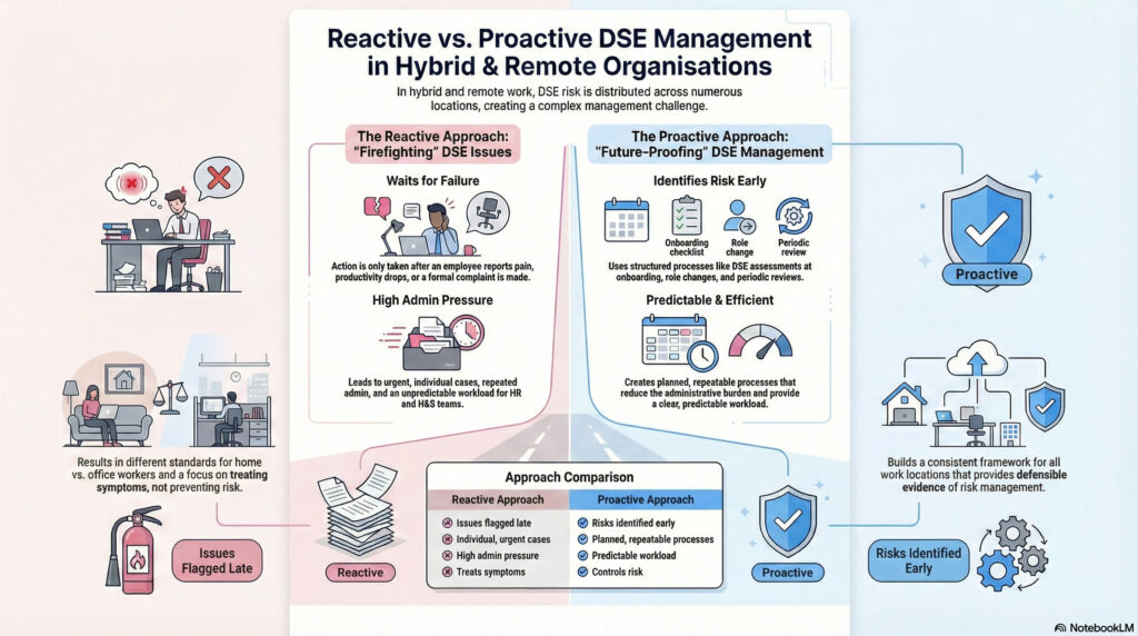 Instead of waiting for pain or complaints to surface, proactive DSE focuses on early identification, clear processes and proportionate control, regardless of where work is carried out.