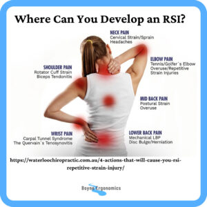 The most common areas associated with RSIs are the wrists and elbows, but they can also occur in the lower limbs, back, neck and shoulders and increasingly in the thumbs.