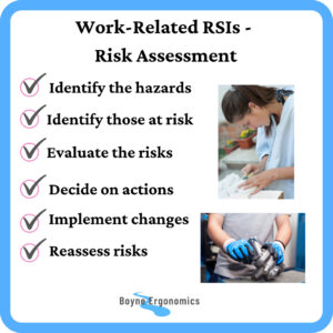 Risk assessments of tasks to ensure tasks that present a risk of RSI are identified, assessed and the risk reduced or eliminated.