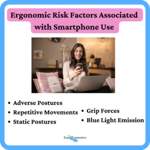 The ergonomic risk factors associated with smartphone use are adverse or awkward postures, prolonged static postures, repetitive stress, grip forces and blue light emission.