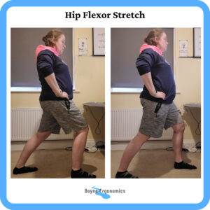Stand up and take a step back with your right leg, keeping your left leg bent at a 90-degree angle. Gently push your hips forward, feeling the stretch in your right hip flexor. Hold for 15-20 seconds and switch sides.