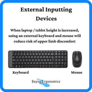 Using an external keyboard and mouse will allow you to sit back in you seat, with the inputting devices close to you when the screen is at the appropriate height.