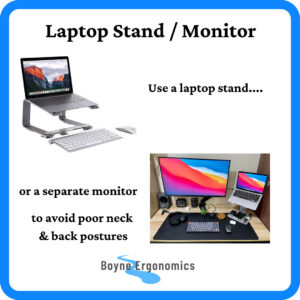 The screen you are using, laptop, tablet or external monitor, should be positioned at arm’s length from your seated position, at a height that allows you to look at the top third of the screen while your head is facing forward.