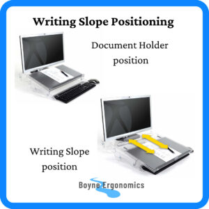 A combined document holder and writing slope allows for improved positioning of documents, both when reading and writing, without impacting keyboard position. They are a very useful tool for improving posture but can take up a lot of surface area and so are only usually suitable for desks 700mm+ in depth.