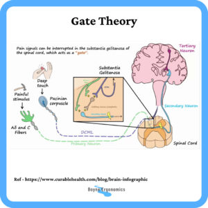 On the other hand, positive emotions and relaxation techniques can help “close the gate,” reducing the brain’s interpretation of pain signals. This theory can help explain why we rub or massage an area after we injure it, as it can activate the gate control mechanism, closing it, reducing the perception of the pain.