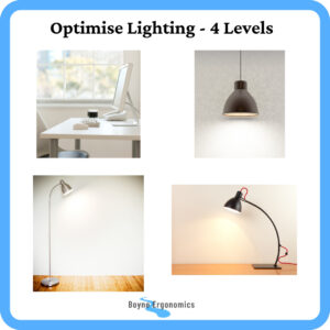 Depending on the direction your work area faces and your proximity to the window, you may experience glare on your screen or in your eyes due to the position of the sun in the sky. I know in my work area, I get more glare in autumn and winter than I do in the summer and so I move my desk to another part of the room, still close to the window but at a different orientation, so I can get the natural light but not the glare, on those rare days when the sun breaks through! We do need natural light so do position your workstation near your natural light source, but make sure it has blinds that can be adjusted to minimise glare, if needed. To check if glare is an issue, turn your screens off and sit at your workstation. The glare will show up as a bright area on the screen. Adjust blinds, screen or desk orientation accordingly.