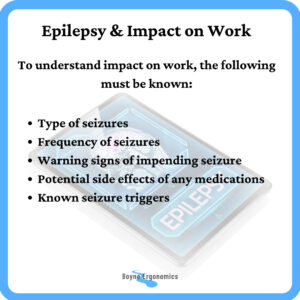 Epilepsy is really an umbrella term for a wide range of symptoms and conditions. It is important that both the employee and employer is aware, in as much as they can be, of the types and frequencies of seizures, any known triggers, any warning signs of an impending seizure, any medication required and potential side effects of the medication, any accommodations required and any musculoskeletal issues that may be present.