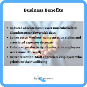 While avoiding penalties is certainly motivating, organisations that implement proper ergonomic interventions typically see additional benefits: